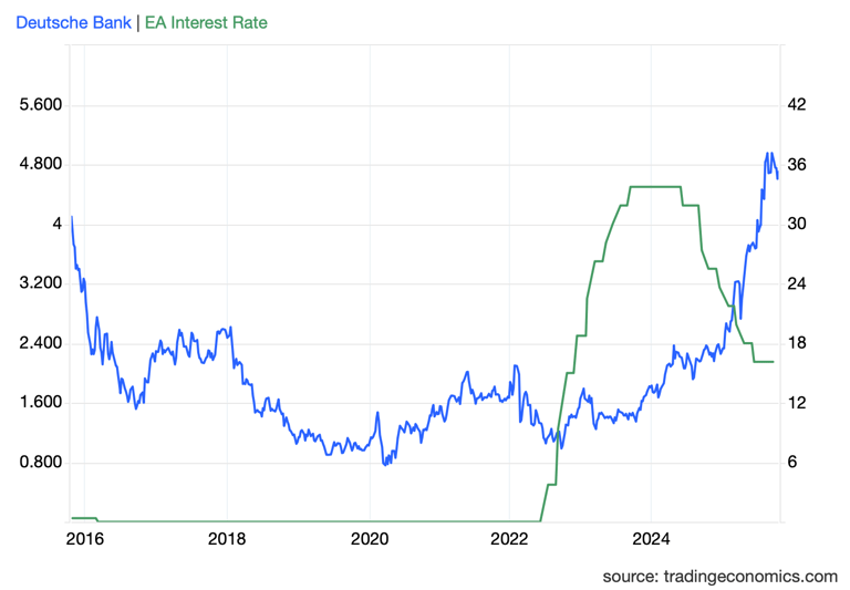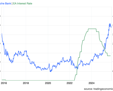 Die Aktie der Deutschen Bank bewegte sich jahrelang auf niedrigem Niveau, geprägt von Vertrauensverlust, schwacher Profitabilität und einem Zinsumfeld, das das klassische Bankgeschäft nahezu unmöglich machte. Für viele galt die Aktie als unattraktiv. Doch genau in dieser Phase zeigten sich erste strukturelle Fortschritte im Unternehmen. Gleichzeitig begannen die Zeichen der anstehenden Zinswende in Europa, die zu diesem Zeitpunkt vom Markt weitgehend ignoriert wurde.